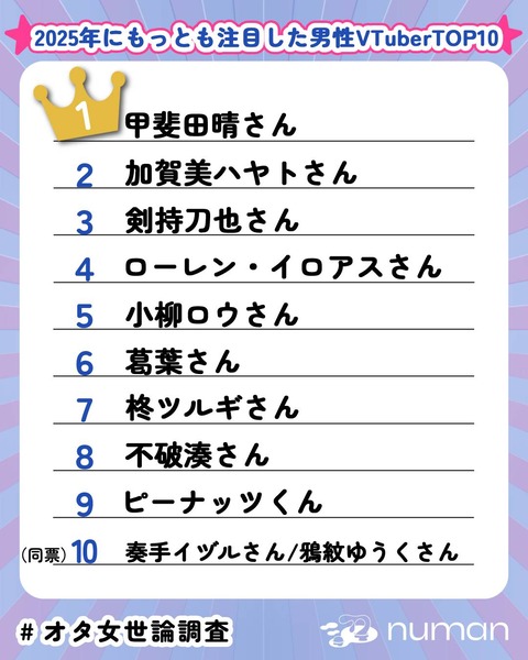 【VTuber】2025年に一番注目した男性VTuberTOP10→1位 甲斐田晴さん/2位 加賀美ハヤトさん/3位 剣持刀也さん