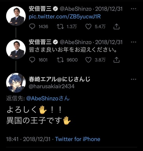 【にじさんじ】ボヤでは無いけど当時首相だった安倍晋三に「異国で王子やってます!よろしく!」って突然リプ飛ばしたときはアンスレもビビってたぞ