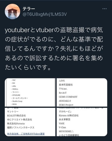 【にじさんじ】ヤバイ人「youtuberとvtuberの盗聴盗撮で病気の症状がでる、訴訟するために署名を集めたいくらい」