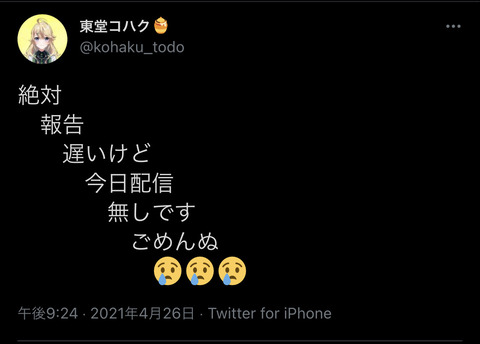 【にじさんじ】東堂コハクさん、「配信無し」を報告 張り手が効いた模様