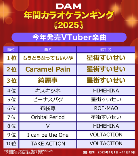 【ホロライブ】すいちゃん、DAM年間カラオケランキング2025の1~3位を独占『すいちゃん・ろふまお・ヒメヒナ・Voltactionしかおらんのか…』