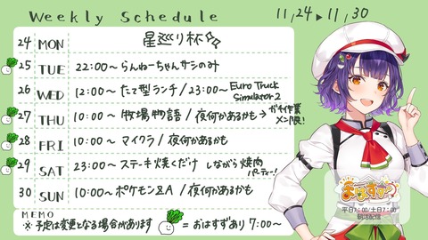 【にじさんじ】七瀬、11/24〜12/7予定表を更新「来週の土日昼はZAの進行状況によって変更になるかもです!」