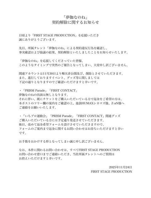 【VTuber】いちプロの夢伽なのね、契約解除に関するお知らせ