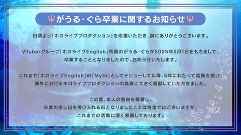 【ホロEN】がうる・ぐら 、5月1日をもって卒業「本人の意向を尊重し、卒業の申し出を受け入れる形となりました」