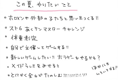 【ホロライブ】あくあ、この夏やりたいことリスト「ホロメンや外部の子と思い出をつくる」「スト6あくケンマスターチャレンジ」「体重測定」「とにかく全力でたのしむ!!!」etc.